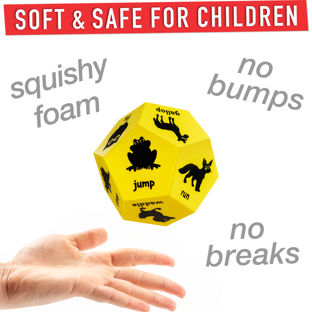 Roll, roar, repeat. This soft 12-sided foam dice turns movement into play with 11 animal actions + a “pick your own” side. Designed for ages 3–8, it builds gross motor skills, coordination, balance, and confidence for indoor or outdoor active play.