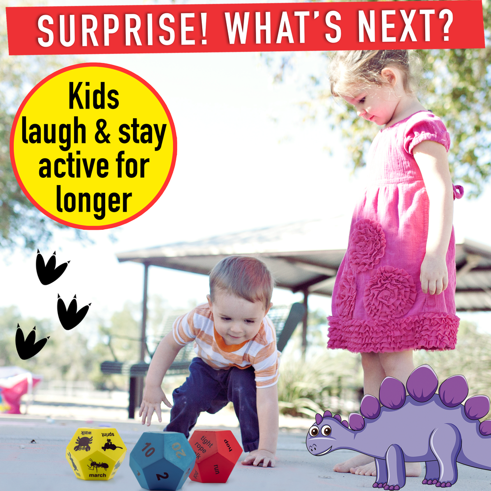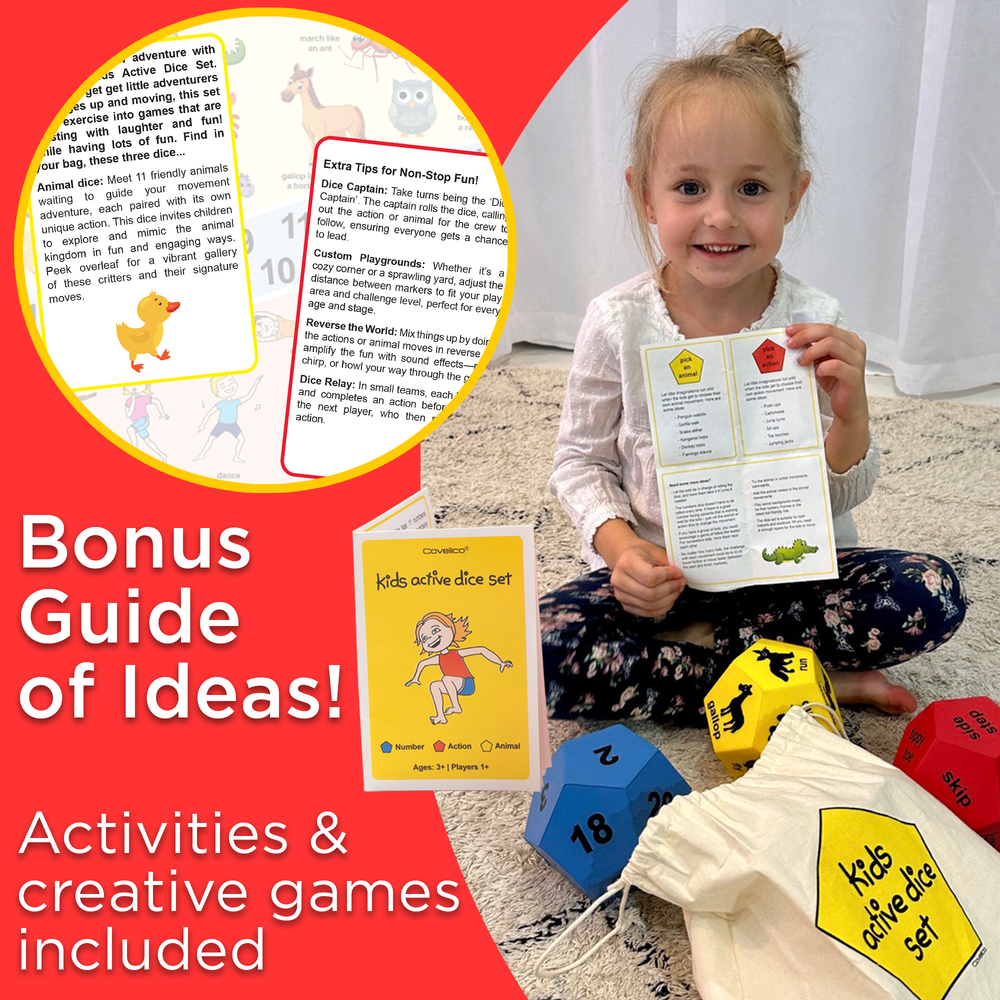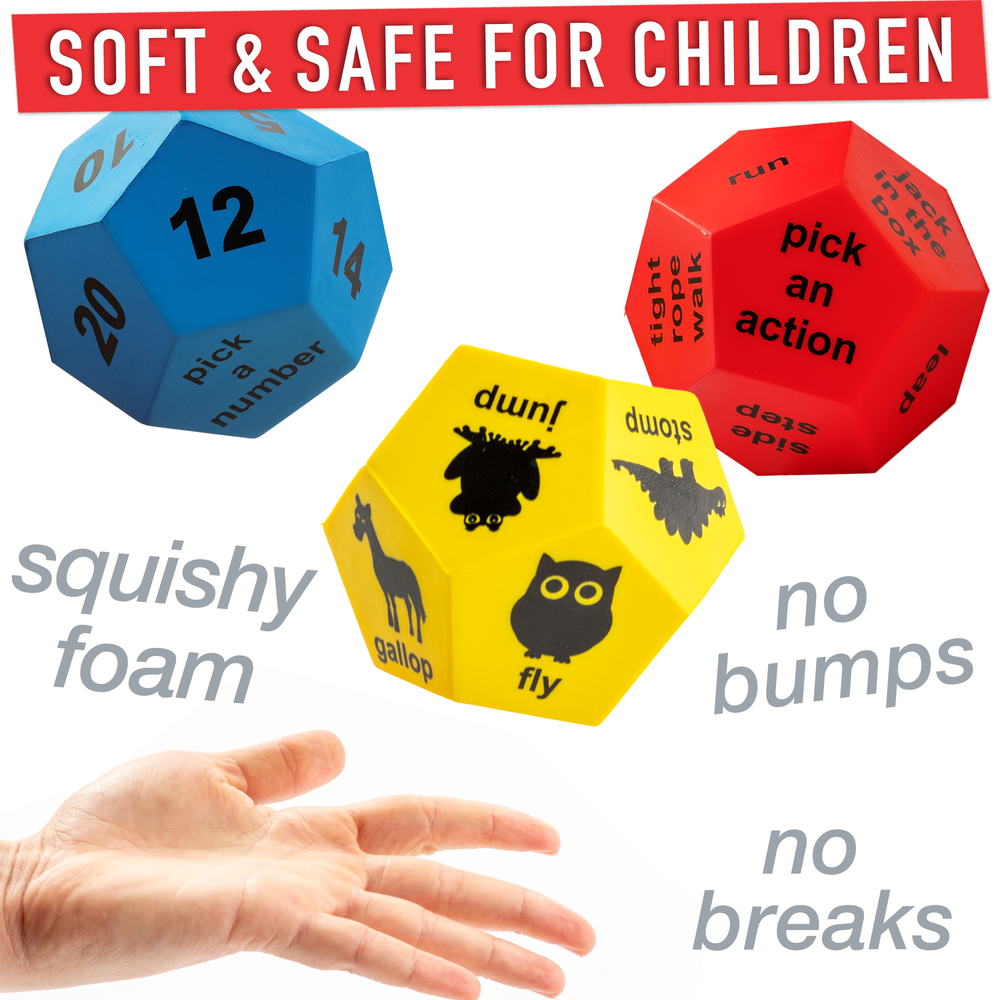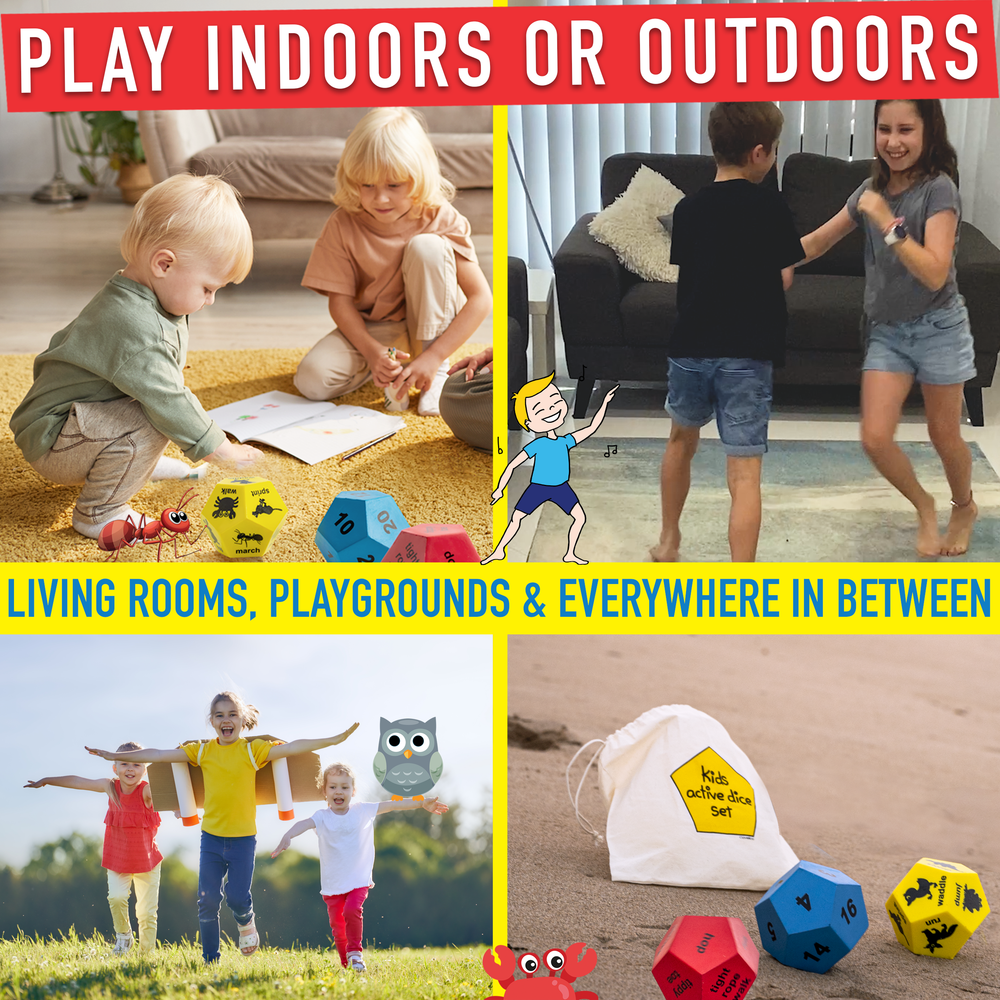 Three dice. Endless fun. This set transforms movement into a game—roll the dice to mix animal moves, action prompts, and numbers for hundreds of silly, active combinations. Designed for ages 3–12, it builds gross motor skills, coordination, balance, and confidence for indoor or outdoor play at home, in classrooms, or in PE.